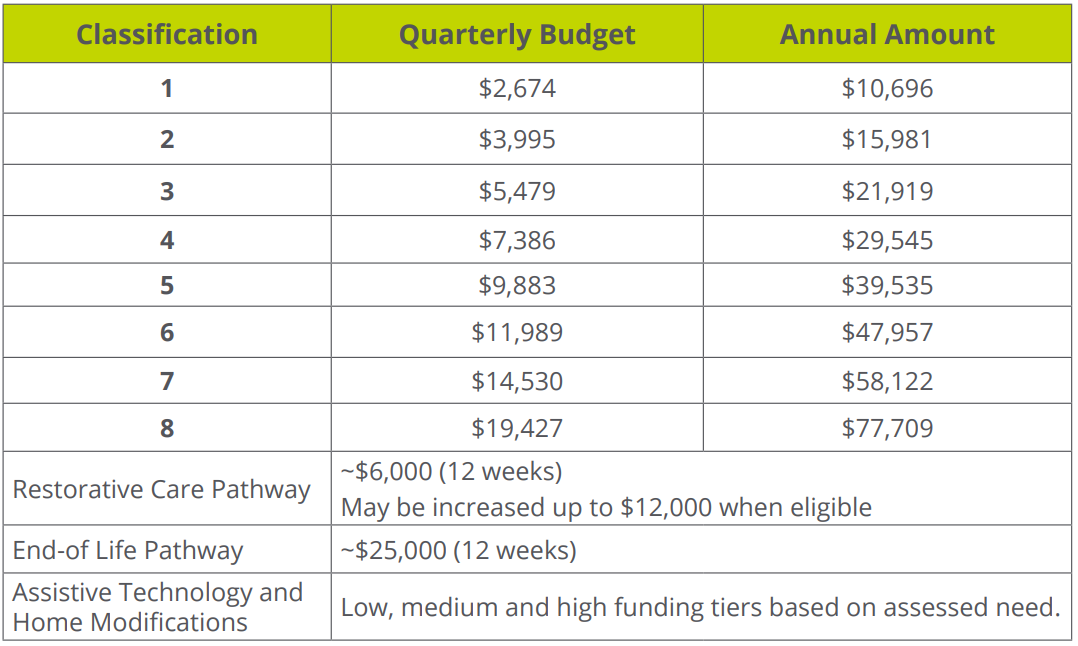 Quarterly Budgets: Support at Home funding is provided every three months, so you will receive your funds at the start of each quarter.